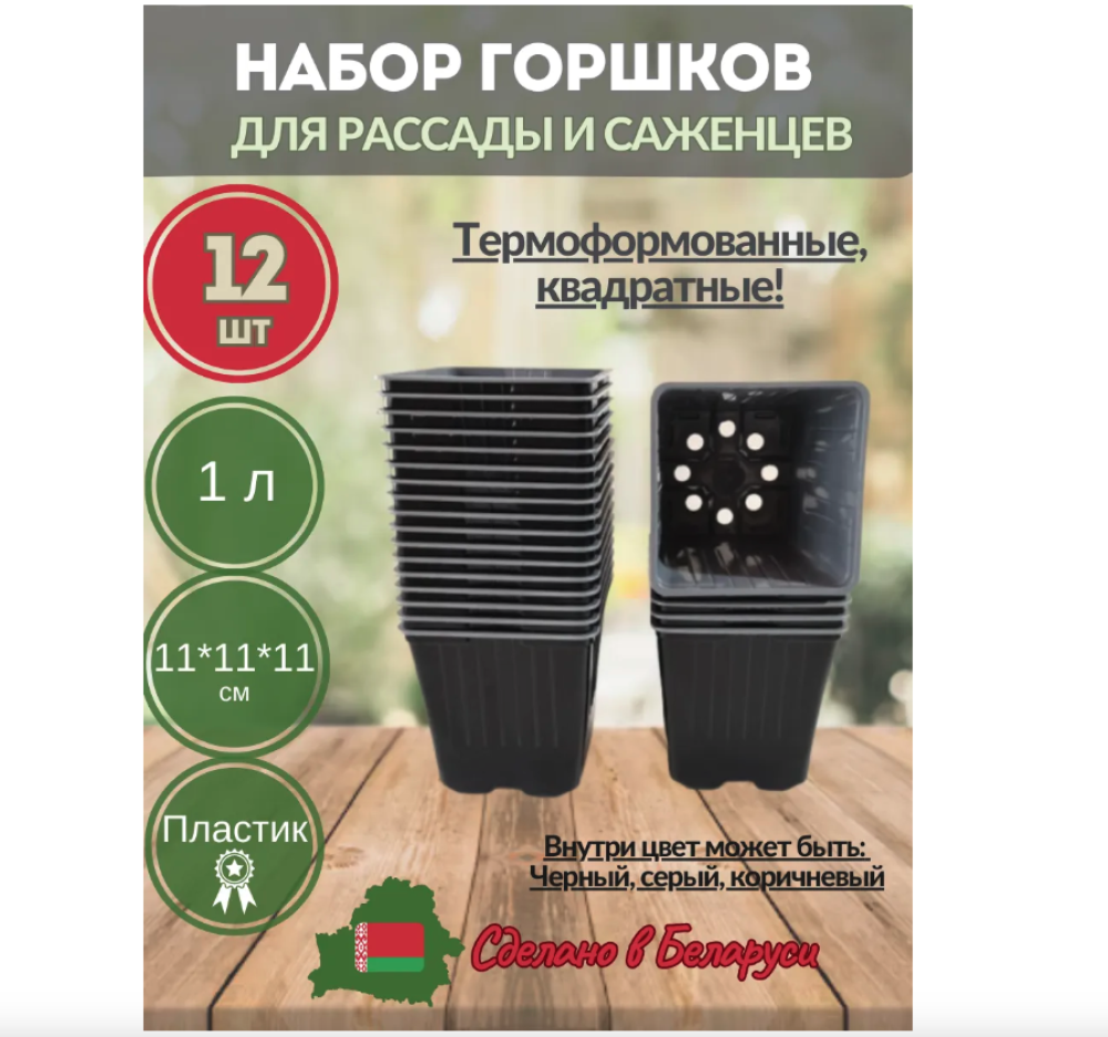 Набор, горшок для рассады в количестве 12 штук. Цвет рассадных горшков может быть темно-серый, серый, коричневый. Наши горшки для рассады удобны в применении. Горшки для саженцев занимают мало места. Большой объем горшка - 1л. , это обеспечивает хорошее развитие корневой системы. Емкости для рассады имеют следующие размеры: 11*11см ширина , высота 11 см